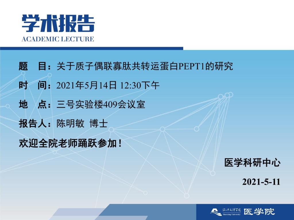 【学术沙龙】关于质子偶联寡肽共转运蛋白PEPT1的研究