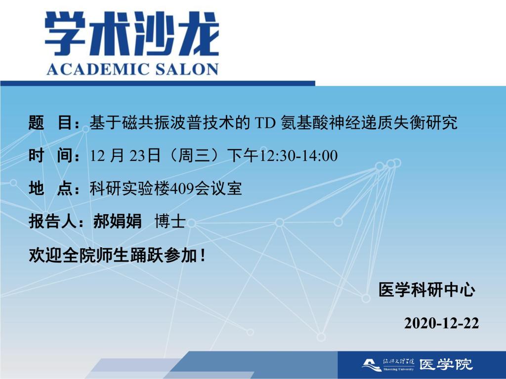 【学术沙龙】基于磁共振波普技术的TD氨基酸神经递质失衡研究