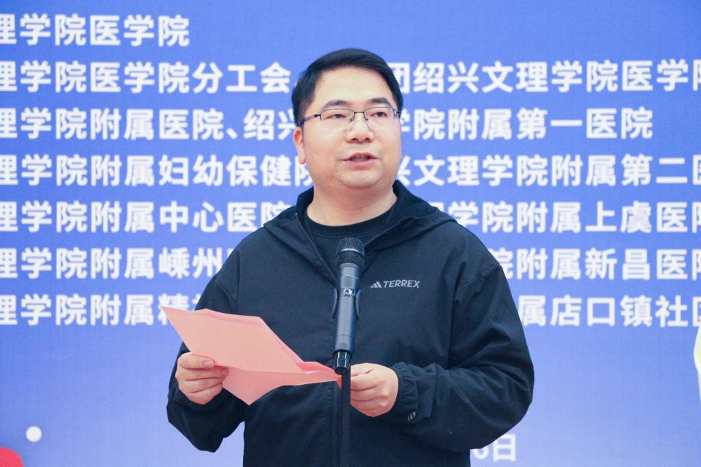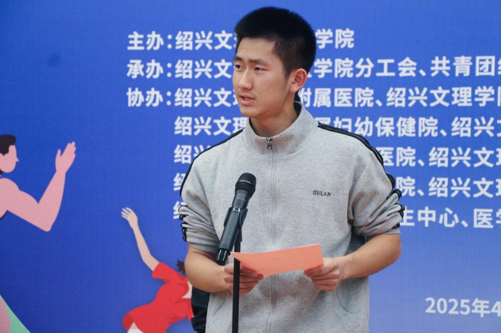 球盟会官网附属新昌医院团委书记俞佳圣和临床医学专业242班王衍博代表运动员发言并宣誓。