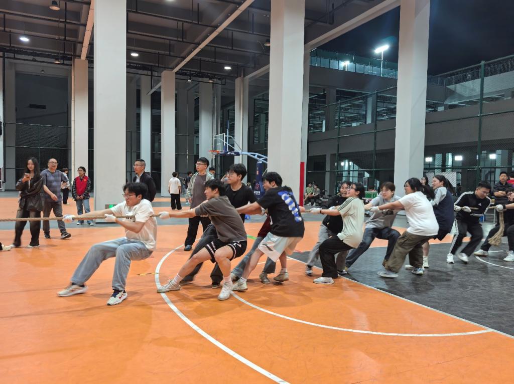 随着一声哨响,拔河比赛正式开始。双方队员双手紧握麻绳,双脚稳稳扎地,一齐发力。脸憋得通红,身子后仰倾斜,口中喊着整齐的口号。场外加油声此起彼伏,麻绳上的红标左右移动,胜负在瞬息之间,每一个人都在为团队全力以赴。羽毛球凌空飞跃,混双搭档攻防交替。前场轻挑、后场扣杀,默契在挥拍间流转。紧盯来球、全力扑救,每一拍都是对胜利的追逐。篮球场上,哨响开战。球员争球跃起,运球似风,传球精准。投篮时凝神聚力,篮球划出漂亮弧线。防守严丝合缝,对抗激烈。场边呼声阵阵,热血与激情在此沸腾。乒乓球在台面上飞驰,选手们迅速移动脚步,挥拍快如闪电。扣杀、削球接连上演,白色小球划出弧线,比分交替上升,现场气氛紧张到了极点。