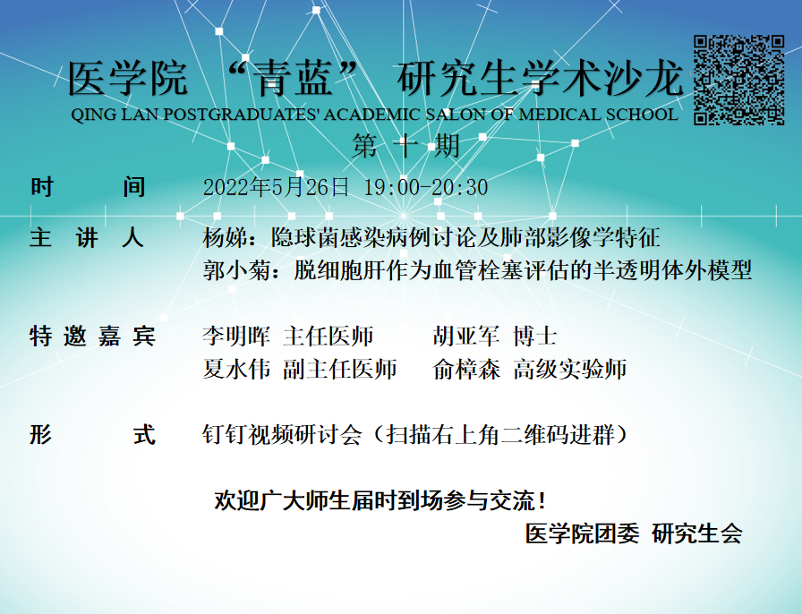 5月26日,球盟会第十期“青蓝”研究生学术沙龙活动通过钉钉平台在线上开展。学术沙龙的特邀嘉宾为李明晖主任医师、胡亚军博士夏永伟副主任医师和俞樟森高级实验师。沙龙主讲人为公司2020级临床医学专硕研究生杨娣同学和公司2021级临床医学专硕研究生郭小菊同学。
